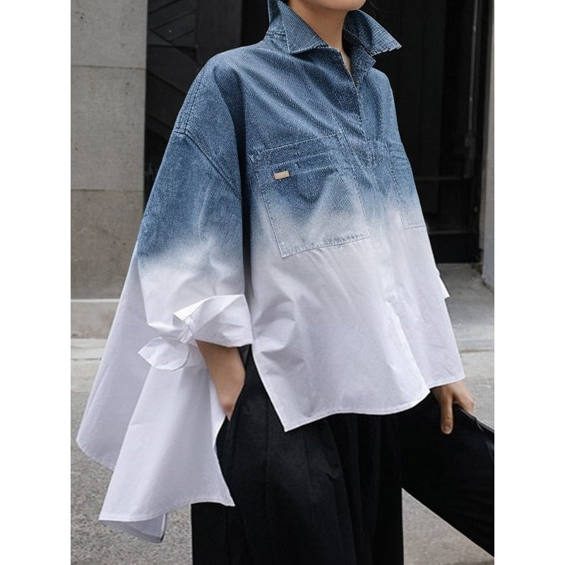 Modernes DesignDie stilvolle High-Low-Bluse mit Farbverlauf und klassischem Reverskragen verleiht einen trendigen Look. Besondere DetailsFalten...
