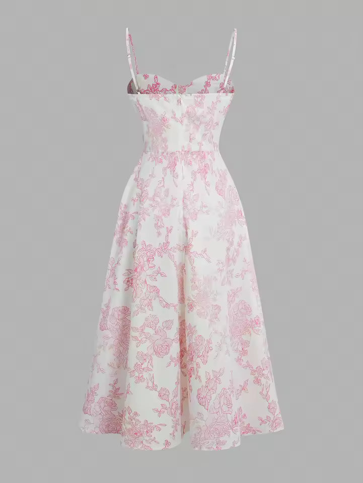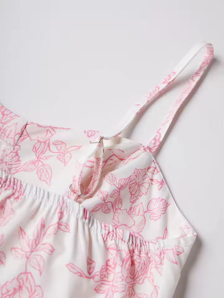 L’abito rosa con stampa floreale esprime un’eleganza romantica e raffinata. Il design leggero e femminile lo rende perfetto per la stagione estiva.